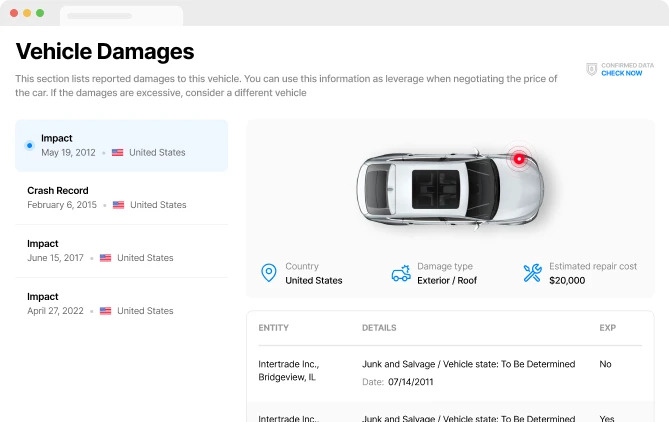 Gain access to the largest database of junk, salvage, and insurance total loss records for detailed information on vehicle history.